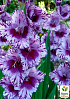 Гладиолус "Shady Frizzle"-это яркий, пёстрый цветок,который несомненно станет вашим фаворитом. Это прекрасный материал для срезки в букет. Цветок белый, с яркими сиреневыми продольными штрихами, на двух нижних лепестках большие густо сиреневые пятна, которые образуют тёмное горло. Лепестки с волнистыми краешками. Средний диаметр цветка 12-14 сантиметров. Листья удлинённые, с острым концом, прямыми краями. Высота цветоноса до 120 сантиметров. Начинает цвести в конце июля, отцветает через три недели. Цветок подвязывают.
