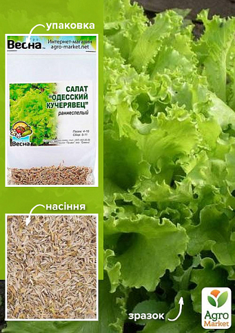 Салат "Одесский кучерявец" - это среднепоздний, высокоурожайный сорт листового салата. Вегетационный период от посева до технической спелости составляет 68-75 дней. Предназначен для выращивания в открытом и закрытом грунте. Формирует плотную розетку листьев светло-зеленого цвета. Листья большие, цельные, с сильно волнистым краем. Вкусовые качества высокие, без горечи. Сорт с длительным периодом хозяйственного использования. Используют для потребления в свежем виде.