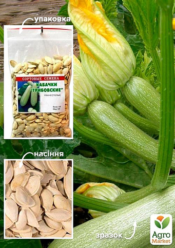 Кабачки "Грибовские" - это кустовое, сильноветвящееся растение. Лист пятиугольный, слаборассеченный. Размер листа - средней величины, окраска зеленая, без белой пятнистости, черешок листа длиной 28-30см. Плод среднего размера, коротко-цилиндрический с ребристостью к плодоножке. Окраска плода в технической спелости светлозеленая.