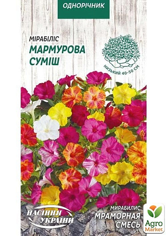 Мирабилис "Мраморная смесь" - это многолетнее растение, культивируемое как однолетнее. Кустики удлиненно-округлые, до 60см высотой. Стебли прямостоячие, густоветвистые, красноватые, одревесневающие в нижней части. Душистые воронковидные цветки, до 2,5см в диаметре, различных ярких окрасок по 3-5 в чашевидной обертке, собраны в щитковидные соцветия на концах побегов, открываются к вечеру и остаются открытыми до рассвета. Причём на одном кусте могут быть цветки различных окрасок. Особенностью данной смеси является необычная окраска цветков. Цветки покрытыми крапинками и пятнами вишнево-красных и розовых цветов. Для посадки лучше всего подходят участки вблизи мест отдыха: большие кусты мирабилиса, усыпанные яркими звездочками цветов и изумительный их аромат добавят романтики вашим летним вечерам. Цветение с июня до заморозков .Посев в полутеплый парник в начале апреля или в открытый грунт в начале мая. Всходы пикируют по одному в 7-9см горшки. После того как минует угроза заморозков высаживают в грунт. Предпочитает глубокие, суглинистые или глинистые, содержащие известь почвы. Кислые и сырые почвы не переносит. Растение свето- и теплолюбивое, засухоустойчивое. При длительной засухе приостанавливает развитие и цветение.