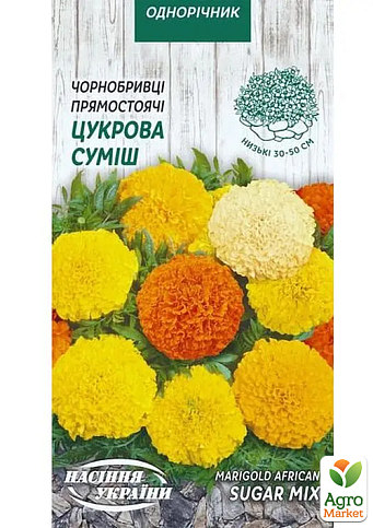 Бархатцы прямостоячие" Сахарная смесь" - это однолетнее растение. Кусты компактные, высотой 30-40см, с прямостоячими боковыми побегами. Соцветия диаметром 5-7см, махровые, желто-оранжевых окрасок. Выращивается посевом семян в открытый грунт в мае-июне или, для более раннего цветения, на рассаду в апреле. Цветет с июня до заморозков. Используют для оформления рабаток, клумб, бордюров, для украшения балконных ящиков и садовых ваз.
