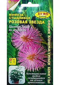 Семена цветов в пакете Розовая звезда - это В России в обиходной речи мимозами часто называют акацию серебристую - другого рода подсемейства Мимозовые, которая является традиционным подарком на 8 Марта. В качестве комнатного растения используется только мимоза стыдливая. Это маловетвистое многолетнее травянистое растение с одревесневающими побегами высотой 30-50 см из тропической Америки. Двоякоперистые листья его особенно чувствительны, складываясь от малейшего прикосновения, а также на ночь, при этом черешок со сложенными листочками листом опускается вниз (при температуре воздуха не ниже 18°С). Если растение после первого раздражения не испытывает следующих, то через определенное время листья снова расправляются. На ночь листья также складываются. С мая по сентябрь на верхушках побегов беспрерывно появляются розовые или лилово-розовые цветки, собранные в изящные шаровидные соцветия.