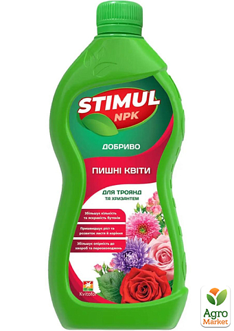 Минеральное удобрение "Stimul" для роз и хризантем "Kvitofor" - это жидкий концентрат для обильного и продолжительного цветения роз (садовые и горшечные) и хризантем (клумбовые, шаровидные, горшечные). Сбалансированный NPK с акцентом на фосфор и калий + хелатные микроэлементы (Fe, Mg, Mn, Zn, Cu, B) поддерживают мощную корневую, крепкие цветоносы, яркую окраску бутонов и устойчивость к стрессам.