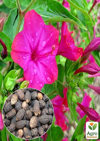 Мирабилис "Розовый" - это ароматные цветки розовой окраски диаметром 5-6 см, раскрываются после 15 часов, а закрываются утром. Многолетнее растение, используется как однолетнее. Кустики 60-80 см высотой. Стебли прямостоячие, ветвистые. Цветёт обильно с июня до заморозков. Используют для оформления цветников, рабаток. Агротехника: Растение свето- и теплолюбивое, засухоустойчивое. Предпочитает суглинистые, хорошо дренированные почвы. Посев семян производят в начале мая непосредственно в грунт. Глубина заделки семян 1,5-2 см. При выращивании рассады семена высевают в апреле в рассадные ящики. При температуре почвы +18-20°C всходы появляются через 5-10 дней. Сеянцы в фазе 2-3-х настоящих листьев пикируют по одному в горшочки. В июне высаживают в грунт, выдерживая расстояние между растениями 30-40 см.
