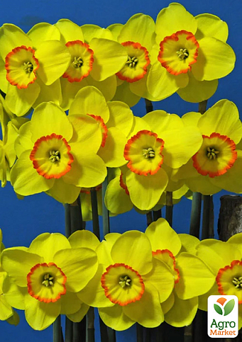 Нарцисс "Pacific Rim" - это эффектный и энергичный сорт из группы крупнокорончатых, который покоряет взгляд яркой окраской и чёткими контрастами. Цветки крупные, до 10-12 см в диаметре, с шелковистыми лепестками насыщенного лимонно-жёлтого цвета и яркой, гофрированной коронкой насыщенно-оранжевого оттенка с лёгким красноватым ободком по краю - отсюда и название, отсылающее к напряжённой географической зоне Тихоокеанского огненного кольца. Окраска буквально горит на солнце, наполняя весенний сад теплом и драйвом. Высота растения 40-50 см, цветоносы крепкие и прямые, устойчивы к ветру и осадкам.