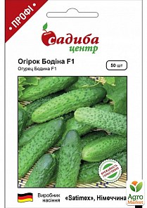 Огурец "Бодина F1" - это новейший, урожайный, самоопыляемый гибрид корнишонного типа. Раннеспелый (38-40 дней от всходов), склонный к букетному завязыванию плодов. Предназначен для летне-весеннего оборота в закрытом и открытом гунте. Плоды ровные, средне-бугорчатые, длиной 8-10см, хрустящие и вкусные. Назначение универсальное. Ценность гибрида: высокая толерантность к стрессовым условиям, устойчивость к комплексу заболеваний.