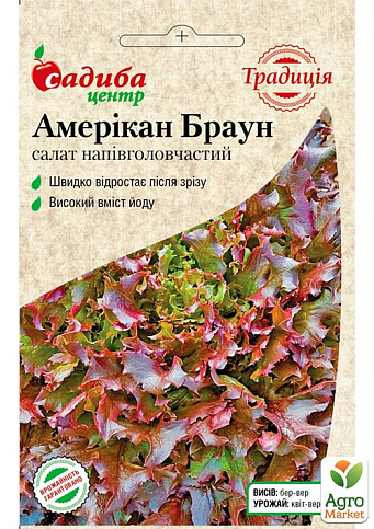 Салат листовой "Американ Браун" ТМ "Садиба центр" 1г - это ранний сорт салата высочайшего качества. Листья волнистые, красно-коричневого цвета, сочные и хрустящие, с высоким содержанием йода. Сорт отличается высокой интенсивностью нарастания зеленой массы (быстро отрастает после среза) и устойчивостью к стрелке – отличное сочетание характеристик для получения свежей зелени с весны и до осени!