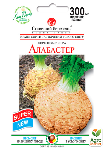 Сельдерей корневой "Алабастер" - это среднеспелый (190-200 дней от всходов до технической спелости) сорт. Посев на рассаду - середина марта. Высадка рассады в грунт в конце мая по схеме 35х40см. Розетка листьев полуприподнятая. Корнеплод округлой, удлиненный кверху, крупный, желтовато-серый, с зеленым оттенком, гладкий, с редко расположенными чечевичками, мякоть белая, расположение боковых корней низкое, масса 400-600г. Погруженность корнеплода в почву средняя, легко выдергивается. Сорт характеризуется высокой урожайностью, ароматичностью, повышенным содержанием сахаров. Корнеплоды содержат минеральные соли и эфирные масла. Употребление сельдерея способствует выведению солей, повышает тонус организма.