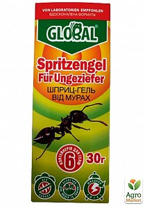 Шприц-гель от муравьев ТМ "Global" 30г - это средство изготовленное в форме шприц-геля, применяется для борьбы против всех видов муравьев. Данный препарат содержит в составе действующее вещество - фипронил, - контактно-кишечный инсектицид с умеренными системными свойствами, а также инертный наполнитель, функциональные примеси и аттрактант, который эффективно приманивает вредителей. При попадании в организм насекомого, фипроніл нарушает основные функции нервной системы, как следствие, гибель муравья наступает от паралича в течение нескольких часов. Насекомое гибнет не сразу, поэтому отравленная особь успевает заразить остальных сородичей, распространяя отраву по всей колонии. Полное уничтожение скопления насекомых происходит в течение 5-7 дней, в зависимости от их количества. Гельэффективно используется для защиты жилых, производственных и лечебно-профилактических помещений, складов, амбаров, подвалов, хранилищ от муравьев-древоточцев, садовых, рыжих, фараоновых и других видов муравьев. Препарат экономичен благодаря низким нормам расхода.