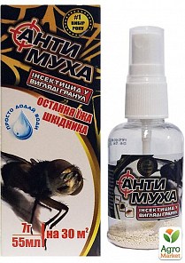 Данный инсектицид предназначен для борьбы с мухами в помещениях, где содержатся животные, а так же в общественных местах и на складах. Препарат Антимуха следует применять в таких местах скопления насекомых, как теплые стены, стены с солнечной стороны, оконные рамы, опоры, части оград, трубы и т.д. Препарат так же эффективен для борьбы с мелкими летающими насекомыми и тараканами.