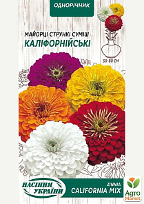 Цинния "Калифорнийские гиганты" - это однолетнее растение. Кусты мощные, раскидистые. Стебли прямостоячие, высотой 80-100 см. Соцветия крупные, диаметром 10-15 см, махровые, разнообразных ярких окрасок. Выращивается посевом семян в открытый грунт в мае, или для более раннего цветения, через рассаду в марте-апреле. Цветет с июня до заморозков. Используется для декоративного оформления клумб, цветников, а также для срезки.