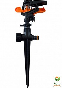 Надійний пластиковий фрегат-зрошувач пульсуючий на ніжці забезпечує потужний полив пульсуючим струменем. Просте регулювання сектора поливу від 0 до 360 °. Функція блокування обраного сектора поливу. Регулювання висоти і ступеня розбивки струменя. Діаметр поливу до 25 м. Максимальна площа поливу: 250 м2. Робочий тиск від 1 бара (звичайний тиск з крана). Універсальна пластикова ніжка за рахунок заднього виходу із зовнішнім різьбленням 3/4 "дозволяє продовжувати послідовне підключення додаткових розпилювачів. Підключення до шлангу за допомогою коннектора. Це дійсно якісний зрошувальний аксесуар, який зручно фіксується на будь-якому грунті, завдяки спеціальному кілочка.