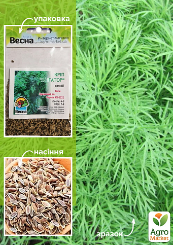 Кріп "Алігатор"- це ранній (40-45 днів від сходу до отримання врожаю) сорт, кущового типу. Призначений для вирощування зеленню. Довго не викидає парасольку, можливе багаторазове зрізання зелені.