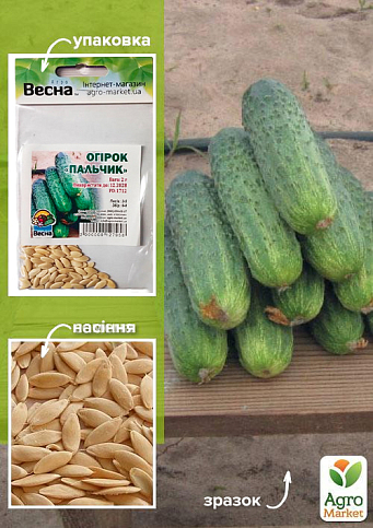 Огірок "Пальчик" - цей сорт гібридного походження для відкритого грунту. Ранньостиглий (від сходів до 1-го збору 40-46 днів), бджолооливальний, салатний, консервний, засолювальний. Рослина сильноплетиста, переважно жіночого типу цвітіння (понад 50%), з пучковим закладенням зав'язей (формуються з пазухи 1-го листка). Зеленець подовжено-циліндричний, темно-зелений, зі смужками середньої довжини, великогорбчастий, опушення біле. У поперечному розрізі округло-тригранний, без порожнеч Маса зеленця 114-120 г, довжина 9-12 см, діаметр 2,7-3,4 см. Толерантний до несправжньої борошнистої роси.