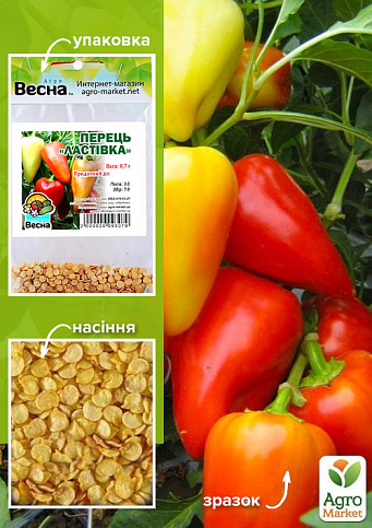 Перець "Ластівка" (Зіпер) ТМ "Весна" 1г- Це середньоранній сорт. Технічна стиглість настає через 120-122 дні після сходу. Рослина напіврозкидиста, штамбова, середньоросла (45-50см). Плоди конусоподібні, слаборебристі, довжиною 8-10 см, в технічній стиглості світло-зелені, біологічно червоні, товщина стінок 5-7 мм, маса 47-79 г, смакові якості хороші, вміст аскорбінової кислоти 96-117 мг%. Урожайність плодів у технічній стиглості до 6,0 кг/м.