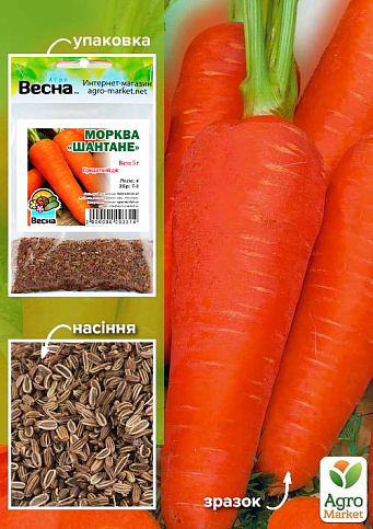 Морква "Шантане" - це середньоранній сорт з відмінними смаковими якостями та високою товарністю. Потужна здорова бадилля. Коренеплоди дуже однорідні, короткі 12-16см, конічні, добре виконані на кінці. Серцевина соковита, інтенсивно-оранжева, за кольором не відрізняється від основного забарвлення м'якоті. Дуже високий вміст каротину, цукрів, майже повна відсутність гіркоти, за дотримання балансу добрив не накопичує нітратів. Дуже високоврожайна. Максимальний урожай коренеплоди набирають на 78-86-й день вегетації. Придатна для вживання у свіжому вигляді та переробки. Стійкий до стрілкування, підходить для підзимових та ранніх термінів посів. Для закладки на зберігання рекомендується практикувати пізні посіви.