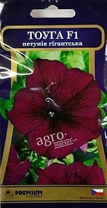 Петунія гігантська "Тоуга F1" - висота 40-45см з великими квітками діаметром 8-10см з рясним цвітінням. Ця група гібридних петуній невибаглива до погодних умов. Дуже добре росте не тільки в сонячні дні але і при прохолодній дощовій погоді. Придатні для вирощування в квітниках, на клумбах, в балконних ящиках. Насіння висівають на розсаду з січня по березень, сходи з'являються вже через 10-15 діб. Через 2 тижні рослини пікірують в горщики. Розсаді необхідний своєчасний полив і підгодівля. Цвіте з кінця квітня і до заморозків