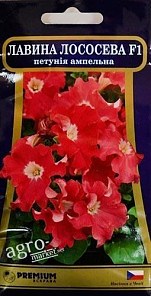 Петунія ампельна "Лавина лососева F1" - це однорічна рослина, з пагонами бічними пагонами, довжиною 50-70 см. Квітки лійкоподібної форми, діаметром 7-9 см, під час цвітіння повністю покривають рослину, утворюючи лососевий каскад . Вирощують посівом насіння в грунт в травні-червні або для більш раннього цвітіння, через розсаду в березні-квітні. Цвіте рясно з червня до пізньої осені. Використовується для квіткового оформлення балконів, садових ваз і підвісних горщиків.