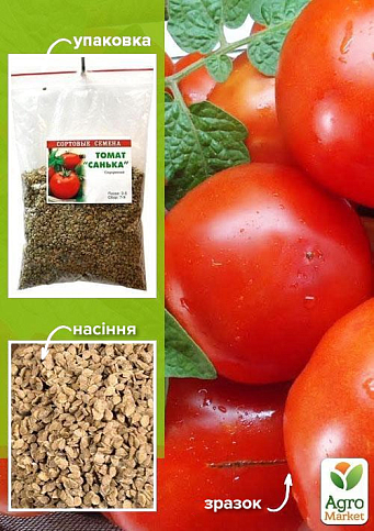 Томат "Санька" - це ультраранній сорт для відкритого ґрунту. Рослина компактна, висотою 30-40см. Плоди округлі, червоні, слаборебристі, масою 80-90г. Перші й 90-100- наступні, 3-4-камерні, без зеленої плями біля плодоніжки. Кисть проста, в кисті по 4-5 плодів. Використовується у свіжому вигляді для цільноплідного консервування та на томатопродукти. Володіє високими товарними властивостями, відмінними смаковими якостями, толерантний до ряду захворювань. Теплолюбна культура. Вирощують розсадою або посівом у відкритий ґрунт. На розсаду висівають з 1 по 10 березня в поживні горщечки розміром 10х10см.