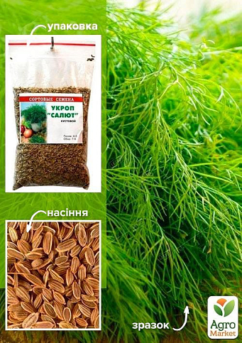 Кріп «Салют» - це унікальний кущовий сорт кропу, що належати до типу кропів, які не жовтіють. Формує потужний листяний кущ. Листя велике, довжина 28-36 см, ширина 30-36 см, зелене з восковим нальотом. Доросла рослина досягає висоти 120-135 см. Можливе вирощування розсадним способом (20-денна розсада). Насіння відповідає вимогам міжнародних стандартів. Висівають у відкритий ґрунт з травня по серпень.