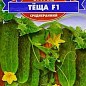 Огірок "Теща F1" - cкороспелий сорт огірка (45-48 день від сходів до плодоношення) партенокарпічний гібрид жіночого типу цвітіння. Призначений для вирощування у відкритому грунті і плівкових теплицях. Посів на розсаду в кінці квітня. Висадка в грунт в кінці травня - початку червня в фазі 3-4-х справжніх листків.