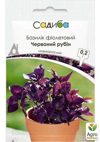 Базилік фіолетовий Червоний рубін - це компактний (росте до 45 см) сорт фіолетового базиліку з надзвичайними смаковими й декоративними властивостями. Покращена варіація сорту Темний опал. Гладеньке темно-пурпурне з відблиском листя, багате ефірними маслами, має приємний аромат і насичений солодкуватий смак, який найкраще ароматизує салати, гарніри й консервацію. Цвіте гарними рожевими квітками, добре прикрасить і городню грядку, й квіткову клумбу. Ідеально підходить для вирощування в горщиках.