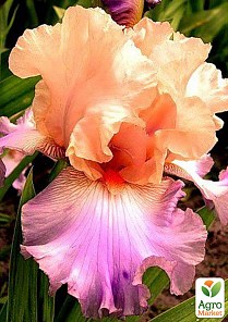 Ірис "Selebration Song" - це дивовижне поєднання ніжно-абрикосових верхніх пелюсток і світлих лавандово-синіх нижніх. Борідка - мандаринова. Незвичайне поєднання кольорів. Оригінальний, великий, гофрований квітка. Дуже популярний.