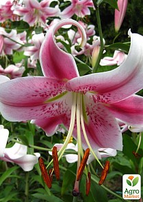 Лілія Тигрова звисаюча "Anastasia" - це ніжність і грація в саду. Високі стебла утримують великі рожево-перламутрові суцвіття з яскравими прожилками. Пелюстки лілій пинк сильно відігнуті назад, а самі квітки пониклі, що додає їм чарівності. Здається, ніби це лілейне дерево, а не кущ, який виріс з однієї цибулини. Ідеальна для зрізу, морозостійка, ефектна, невибаглива, лілія Анастасія - давня улюблениця флористів і ландшафтних дизайнерів.