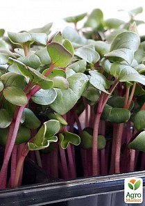 мікрозелень " Редис" - Завдяки своєму освіжаючому аромату і пряно-пекучого смаку мікрозелень редису стане гармонійним смаковим акцентом в стравах з багатим і природним смаком. Містять велику кількість вітаміну С. Вживання паростків редису в їжу сприяє поліпшенню стану шкіри і волосся, загальному зміцненню організму.