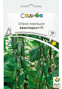 Огірок Авантюрист F1 - це ранній (38-40 днів) самозапильний гібрид корнішонного типу для вирощування у відкритому й закритому ґрунті. Сильна плетиста рослина здатна зав’язувати плоди пучками - в одному вузлі по 3-4 огірочка. Зеленці довжиною 8-10 см, вагою 20-30 г, від крупно до середньобугристих, щільні й дуже міцні, циліндричної форми, насиченого темно-зеленого кольору. Стійкий до збудника вірусу огіркової мозаїки й борошнистої роси, прекрасно пристосований до регенерації. Підходить для споживання в свіжому вигляді, соління й консервування.