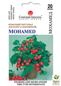 Томат карликовий "Мохамед" - найбільш ранній, найсолодший і найсмачніший ультракомпактний помідор з нашої колекції. Кімнатна міні-карликова рослина висотою менше 30 см., З щільно зімкнутої рясним листям через 45-55 днів після пересадки зав'язує яскраво-червоні вішневідние плоди в досить великій кількості для такого маленького томату. На красивих кистях одночасно дозріває по 6-8 плодів. Чудовий смачний помідор, що ідеально підходить для домашніх садів і відмінний вибір для додавання в салати або кулінарні витвори.