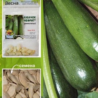 Кабачок Нефрит, скороспелый (53-58 дней) сорт. Растение мощное, кустистое. Плоды тёмно-зелёные, цилиндрические, слаборебристые. Мякоть зеленовато-белая, плотная, нежная. Ценные качества сорта: высокий выход ранней продукции, товарность, великолепные вкусовые и технологичные качества. Для употребления и переработки убирают зеленцы длиной 15-18см. Рекомендуется для детского и диетического питания, консервирования.