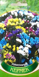 Лимониум "Кермек" - это однолетник высотой 50-60 см. Цветет с июня по сентябрь. Цветки собраны в щитковидные соцветия длиной до 10-12 см. Окраска цветков очень разнообразна - оранжевая, темно-синяя, желтая, белая, розовая. Предпочитает открытые участки с легкой водопроницаемой, удобренной почвой. Выращивают рассадным способом. Семена высевают в апреле. Растения высаживают на постоянное место в начале июня. Используют для посадки на клумбах и в группах, на срезку для живых и сухих букетов. Интенсивность окраски в сухом букете кермек сохраняет несколько лет.