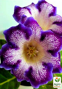 Тайгер блю - это очень эффектный гибрид простой тигровой глоксинии. Куст относится к средним по росту глоксиниям, его высота не превышает 30 см. Листья опушенные, широкие, длиной до 20 см с узорчатым краем. Цветки крупные, семилепестковые, белые с желтой сердцевиной, от которой расходятся темно-фиолетовые бисеринки, у края лепестков сливаясь в кайму сине-фиолетового цвета. Интенсивность окраски зависит от уровня освещенности и качества зимовки. Размер цветка может достигать 12 см в и 8 см в глубину. Число бутонов на одном кусте от 10 до 15 штук.