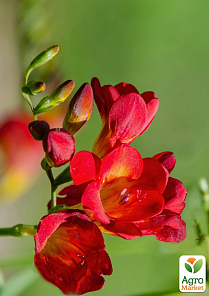Фрезия простая красная - это сорт фрезии,который ничем не уступает своей махровой сопернице. Яркая окраска цветков и нежнейший аромат покоряют всех садоводов. На высокой цветочной стрелке располагаются до 12 бутонов. По мере развития зеленые бутончики сначала окрашиваются в темно-красные тона, затем раскрываются крупными желто-красными цветами. Лепестки ярко-желтые в глубине воронки к краю приобретают насыщенный красный цвет. На некоторых лепестках имеются узоры в виде красных всполохов. Растение радует своим цветением и ароматом с середины лета.