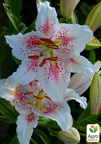 Лилия Тигровая "Muscadet" - красивоцветущий многолетник с ароматными «тигровыми» цветками. Среднерослый, стойкий к заболеваниям и морозам сорт. Цветы хорошо сохраняются в срезке. Стебли прямые, крепкие. На одном цветоносе формируется до 14 цветков диаметром 15-20 см, но одновременно открывается до 5 штук. Лепестки белоснежные, с эффектными розовыми брызгами, с волнистым краем. Во время цветения тигровые лилии Muscadet источают приятный насыщенный аромат, который к вечеру усиливается и ощущается на большом расстоянии — запах распространяется далеко по саду, а в букетах лилии Мускадет ароматизируют всю комнату и даже дом.