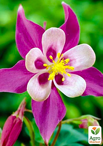 Аквилегия "Mckhana Hybryds"- это сорт представленный разновидностью, отличающейся крупными, немахровыми цветками. 5 ярких лиловых чашелистников обрамляют 5 штук светлых, белых по наружному краю, округлых лепестков. Желтые тычинки на их фоне создают яркий акцент. Шпорцы недлинные, закрученные.Кустики аквилегии Mckhana Hybryds достаточно высокие и раскидистые. Сажать их лучше позади цветочной композиции по одному или группами. Сорт не отличается долговечностью, однако самовысевом быстро распространяется по участку.