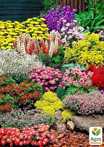 Декоративная смесь "Альпийская горка" ТМ "Vesna Exclusive" 1г – это набор из низкорослых цветущих растений. В нее входят семена арабиса, гипсофилы, гвоздики альпийской, стахиса, обриеты, вязеля, ясколка, седума, синеголовника, лапчатки. Смесь позволит самостоятельно создать альпийскую горку, красочно украсить место у водоема, создать бордюр на цветнике. Специально подобранные сорта и виды декоративных растений обеспечат буйное цветение с ранней весны до первых заморозков. Можно высевать на рассаду в феврале-апрель или сеять сразу в грунт под зиму или весной в мае. Семена заворачивают на глубину 0,5-1 см. Горка должна освещаться солнцем. Важно обеспечить цветам хороший дренаж. Лестницы регулярно поливают и несколько раз подкармливают минеральными удобрениями. Обязательно убирают сорняки.