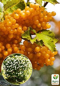 Эксклюзивный сорт желтой калины ”Солнце золотое» – это многолетнее растение семейства Адоксовые. Сорт «Солнце золотое» формируется в виде раскидистого куста высотой до 2-3м. Калина «Солнце золотое» выпускает сильные прямостоячие побеги, окутанные красивыми темно-зелеными ребристыми по краю листьями. Весеннее цветение выглядит очень декоративно и нарядно. Большие белые цветы собраны в зонтики и разбросаны на кусте. Цветение и дальнейшее образование плодов происходит на ветвях прошлого года. Желтые ягодки представлены костянкой с косточкой. Куст хорошо поддается формировке и обрезке, но нужно учитывать, что плодоносит калина на прошлогодних побегах. Цветет весной. Цветы крупные, белые, собранные в большие зонтики. Имеют очень декоративный вид. Плодоносить начинает на второй-третий год после посадки. Плод — костянка с круглой косточкой. Сам плод не большой, до 1см в диаметре. Плоды собраны в гроздья. Цвет спелой калины желтый. Кожура тонкая. На вкус ягода сладко-горькая. Плодоносит обильно.