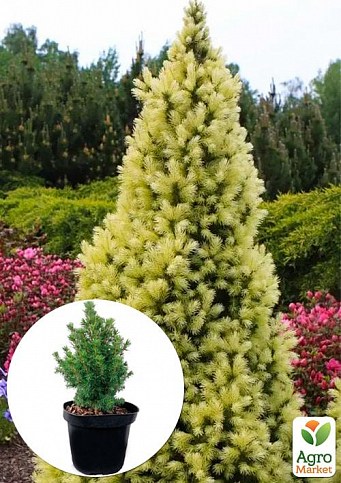 Ель канадская Дейзи Уайт (Picea glauca Daisy's White) - это есль конусовидной формой кроны, которая очень напоминает ель канадскую Коника (Conica). Хвоя желто-зеленая мягкая. Особенно Picea glauca Daisy White бывает декоративна с появлением новых приростов желтовато-белого цвета в мае-июне, позже приросты зеленеют. Если в период появления первого весеннего прироста погода солнечная, белая хвоя может обгорать. Второй летний прирост обычно зеленого цвета. Растет относительно медленно и в десятилетнем возрасте достигает высоты 0,8 м.