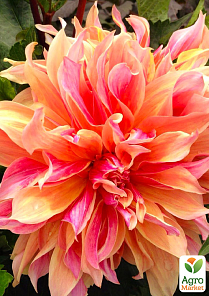 Цветок: 15-18 см. Высота растения: 70 см. Соцветие махровое, по краям кремово-розоватое, к центру ярко-розовое. Лепестки плоские, широкие, по краю заостренные слегка подкручиваются к стеблю.