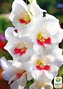 Гладиолус Нанус "Carine" - это низкорослый нарядный сорт, типа нанус. Отличаются компактным габитусом, который позволяет выращивать луковицы не только в саду, а и дома в контейнерах в лоджии или на подоконнике. Бутоны с нежными кремово-белыми кончиками. Цветки эффектные белые с широкими штрихами от основания лепестков насыщенного розово-фиолетового цвета-фуксии. Сорт Carine нанус сохраняет красивую листву до поздней осени.