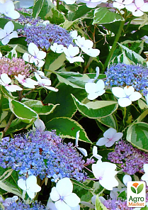 Гортензия крупнолистная вариегатная Мариесии Вариегата - это красивый низкорослый декоративный кустарник. Листья зеленые с неравномерным белым окаймлением. Куст высотой 0,9 – 1,1 м и шириной 1,7 – 1,9 м. Рост быстрый. Цветет с июля по октябрь. Цветет на побегах прошлого года щитковидными соцветиями розового цвета. Меняет цвет на голубой в кислой почве и при поливе квасцами.