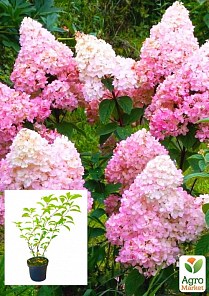 Гортензия метельчатая 2-х летняя "Vanilla Fraise" - это прекрасный обильно цветущий сорт образующий прямостоящий куст до 3 м в высоту. Цветы Гортензии метельчатой Vanille Fraise сравнивают с ванильно-клубничным рожком из-за формы и цвета. Зацветает она широкопирамидальными соцветиями изначально белого цвета, позже, снизу вверх окрашивается в клубнично-розовый, осенью темнеет.