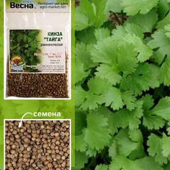 Кинза "Тайга" (Зипер) ТМ "Весна" 7г - это раннеспелый сорт. Период от полных всходов до начала хозяйственной годности 45-50 дней. Растение компактное, высотой 40см. Розетка листьев полуприподнятая, лист среднего размера, среднерассеченный, зеленый, край зубчатый. Масса одного растения до 40г. Растение холодостойкое. Имеет сильный своеобразный запах. Листья молодых растений используют в кулинарии. Семена добавляют как приправу для ароматизации хлеба и кондитерских изделий, в маринады, при приготовлении пряных смесей. Ценность сорта: идеален для получения пучковой продукции высокого качества.