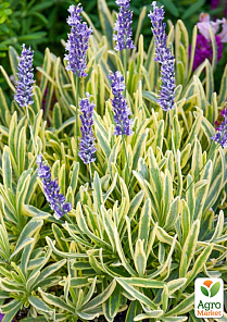 Лаванда пестролистная "Platinum Blonde" – многолетнее вечнозеленое красивое растение, которое растет в виде полукустарника. Cравнительно не высокое растение, вырастает до 70см высотой, но разрастаться может до 1 метра в ширину, так как имеет множество побегов. Основной декоративности достигает во время цветения, когда распускаются непревзойденные фиолетовые, либо же фиолетово-голубые колоски соцветий, собранных в 6-10 цветков. Помимо прекрасных медоносных качеств, лаванда отличается засухоустойчивостью и неприхотливость, редко поражается садовыми вредителями и является ценным растением-сухоцветом. Увидев лаванду на пике цветения, невозможно не влюбиться в ее лиловые цветы и свежий аромат. Отличается мягкими серо-зелеными листьями, края которых подчеркнуты широкими сливочными линиями, благодаря чему лаванда очень эффектно смотрится, особенно, когда растение купается в лучах летнего солнца. В процессе роста растение образует плотный, компактный, ажурный кустик. Цветет красивыми ароматными цветами синего цвета. Лаванда очень ценится среди садоводов, благодаря своему непревзойденному аромату и красивейшему внешнему виду, в связи с чем является одной из основных деталей каждого солнечного сада.