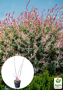 Ива розоволистная Flamingo – это сорт необычным окрасом листьев. На кончиках побегов (молодые приросты) они розовые, из-за чего сорт олучил свое название. Со временем окрас меняется, и листья становятся зелеными с белыми пятнами. Прекрасный яркий кустарник для прибрежных зон.
