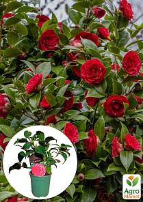 Камелия цветущая японская "Eugenia de montijo"- это эффектный сорт камелии с ярко-красными махровыми «розетками» на фоне глянцевой вечнозелёной листвы. Цветёт с конца зимы до ранней весны, когда в саду ещё мало красок. Подходит для контейнеров и полутенистых участков с кислой почвой.