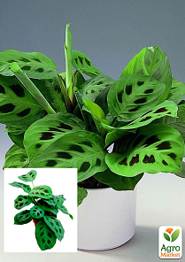 Маранта "Kerchoveana" - это самый известный сорт и самый распространенный. На самом деле рисунок листа практически двухцветный: общий фот средне-зеленый, по обе стороны от центральной жилки симметричные темные пятна - у молодых листьев они темно-зеленые, с возрастом коричневые. По форме пятна как отпечатки кисти или широкие мазки, никогда не сливаются в сплошную линию. Продольные жилки выражены слабо, выступают над поверхностью листа, но не слишком сильно.