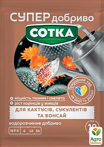 Минеральное удобрение для кактусов, суккулентов и бонсая "СОТКА" - это высококонцентрированный водорастворимый комплекс, разработанный специально для кактусов, суккулентов и бонсай. Сбалансированная формула содержит пониженное содержание азота при повышенном уровне фосфора и калия, что способствует развитию мощной корневой системы, формированию плотных побегов и обильному цветению, а обогащение микроэлементами (железом, марганцем, цинком, медью и бором) предотвращает хлороз и деформацию листьев, усиливает способность растений к адаптации в условиях ограниченного субстрата и переменчивого микроклимата.